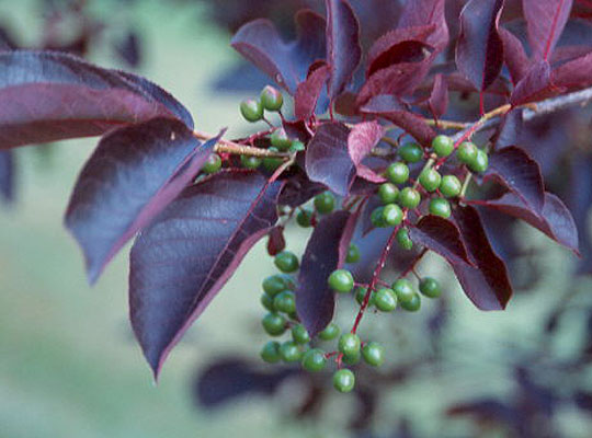 With a desirable shape this small ornamental is a good choice for parks and planting beds. Schubert is best known for its purple foliage. The berries can be harvested as early as July or August and into the fall.